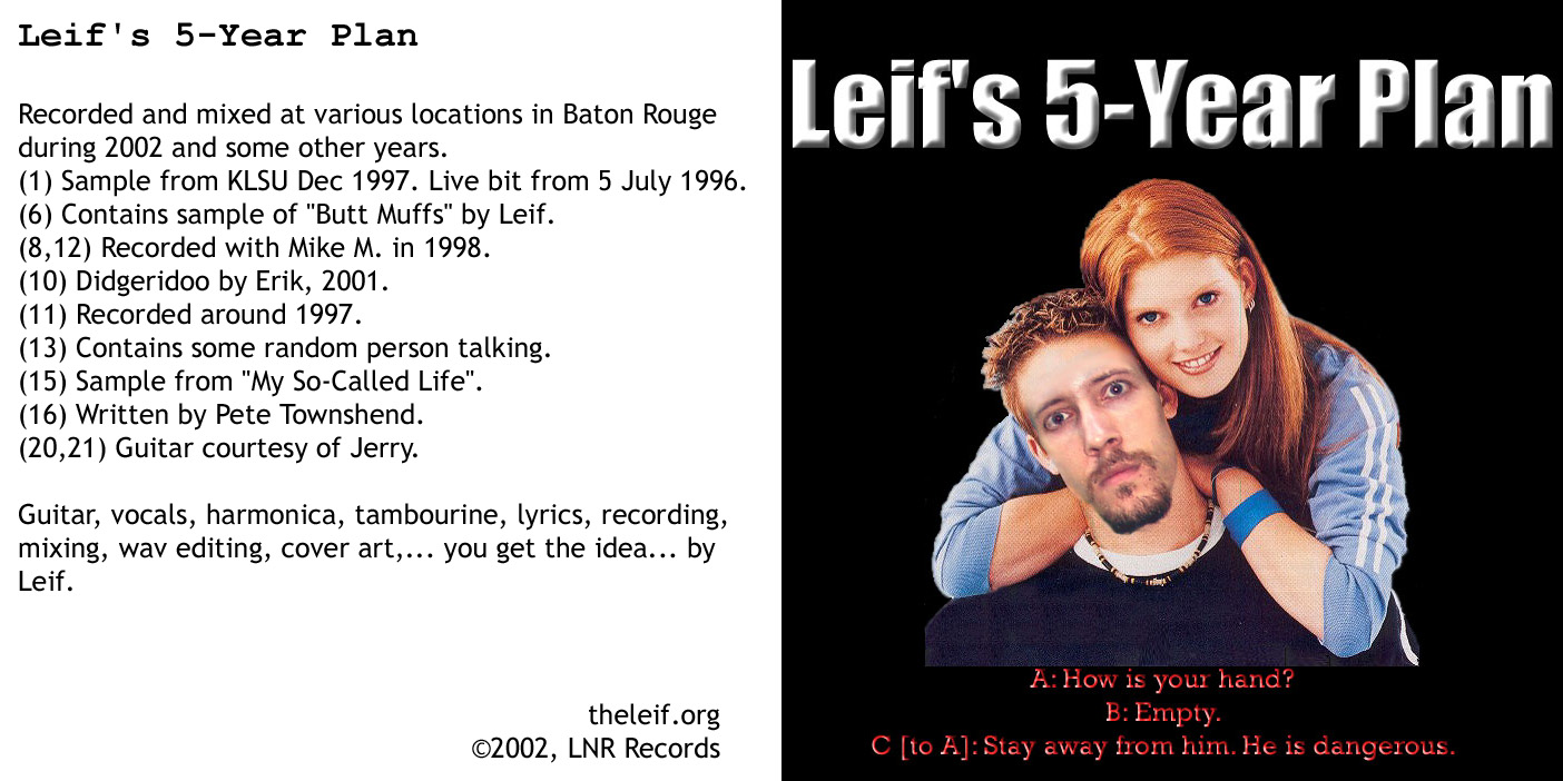 | Notes | The first voice in the beginning is the DJ guy from KLSU's local show back in December 1997 when I did the New Year's Eve show. The live bit goes back even further to 5 July 1996 when I played live at Bryson's Café, a christian café. You can hear them complaining about my "vulgarities". | |
