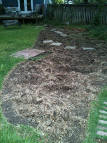 Today was the day to scalp some turf grass in preparation of my hoeing next month (or so), which I'll be doing instead of tilling. I dropped the mower and went at it. I went slowly to give grasshoppers a chance to hop away. Then I moved the stepping stones to what may or may not be their final locations. I just placed them on top of the ground without digging. I think I'll level a couple of them later on when I decide it's good.