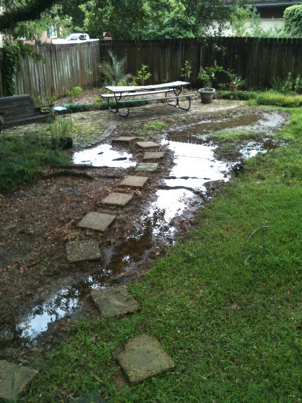 Another storm, more proof that it's a rain garden I built. I've started listing plants that would do well in all that water but still be ok when it's dry. My list has goldenrod, lyreleaf sage*, inland seaoats, buttonbush*, spiderwort, American beautyberry*, and Turk's cap. Depending on the price and availability, I might buy the ones with asterisks from the Hilltop Arboretum PlantFest on Saturday. Or I may just go with seeds and buy only trees (for my front yard plan).