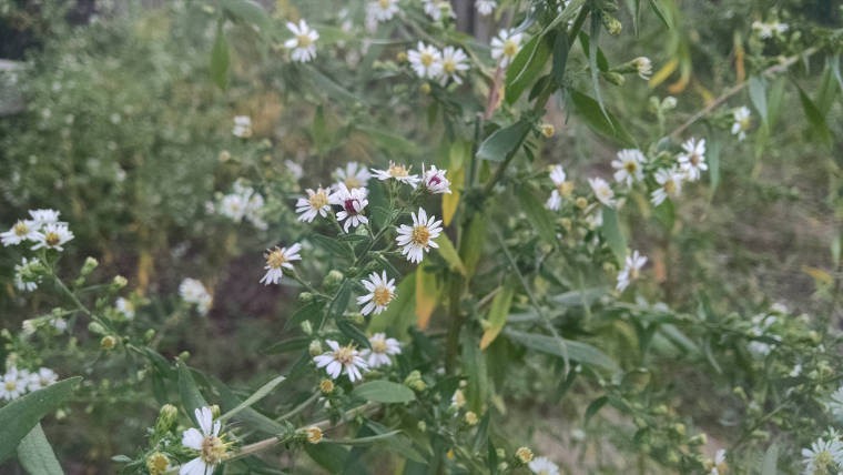 Ah, here are some lovely white asters. They grow all summer and finally bloom in October. Bees love them.