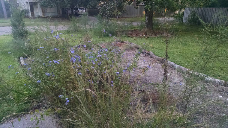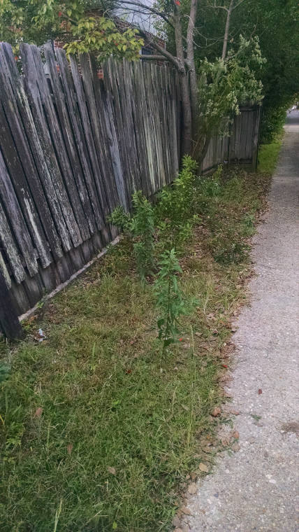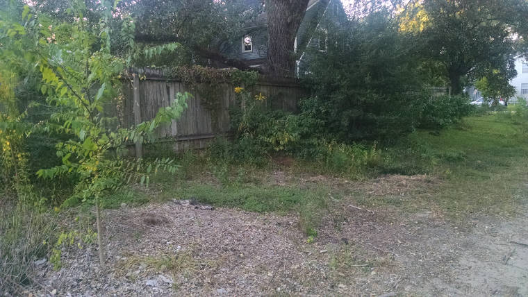 That picture is what it looks like farther toward the alley entrance. There's some mistake-looking common hackberry growing at left, a bunch of stuff in the middle surrounding Carolina buckthorn, and a large grove of male yaupon toward center-right. Virginia creeper is on the fence. I did start hoeing the grass a few weeks ago, but I haven't finished. I'm still not sure what to do here. Shrubs? Wildflowers and grasses from seed?