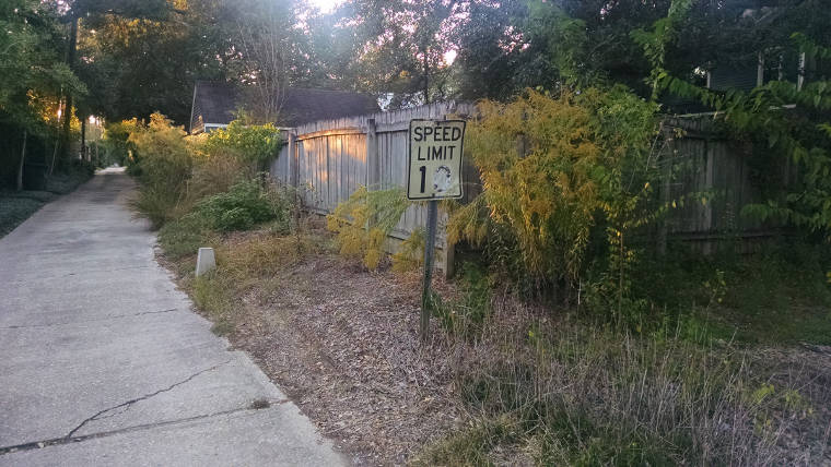 And that was turning to the left a bit to see the alley entrance. The tall goldenrod is now starting to droop behind the (way too fast) speed limit sign. Behind that is a large patch of herbicide-sprayed ground with a bunch of dead seeds I paid for. Then two coralbean, dying partridge pea and Maximillian sunflower, etc. Wild grapes are growing on the fence. I don't think I'm there yet.