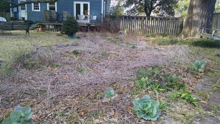 What stands out the most in this picture are the cabbage I planted a year ago and the Christmas tree from December. (It's somehow still green.) All those goldenwave annuals from last spring are now brittle little twigs, bent over like straw. There's a poof of Gulf muhly at left and a patch of swamp sunflower, but they're hard to see right now. Also hard to make out are some young deciduous shrubs: buttonbush, Virginia sweetspire, and strawberry bush.
