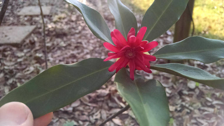 So I was very happy and surprised this morning to see that my new Florida anise (Illicium floridanum) that I planted in September has a brand new flower. I had no idea how big the flower was going to be. It's actually quite tiny: 1.8" (4.5 cm).