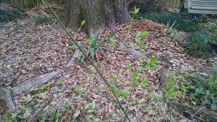 It's evergreen and has been in shade all winter because of the wood fence and low winter sun, but it's now getting full sun, as planned. Scattered around it are lanceleaf coreopsis and Rudbeckia. At top-right is a new bay tree. In the ICEE cup is a mountain mint of some sort. And one day, I'm hoping some muscadine seeds will sprout and grow up the wood fence behind all of this.