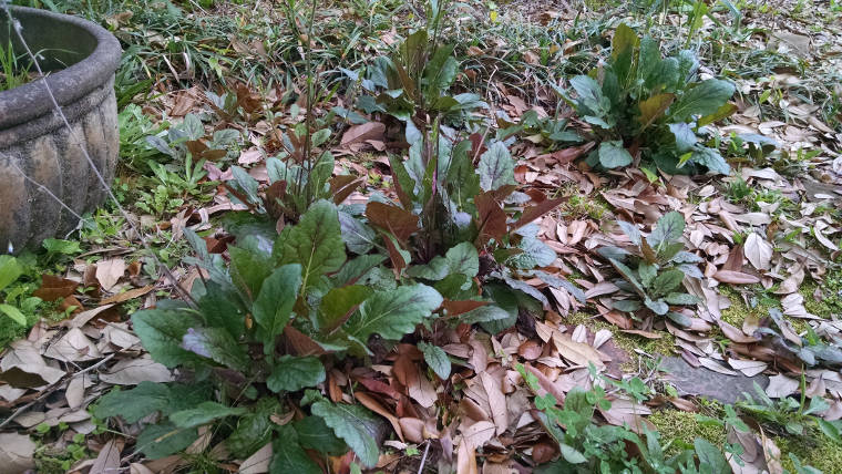 Lyreleaf sage is taking over the bricks where the picnic table is in the backyard. I haven't decided how to approach this yet. It's hard to rake and sweep right now; oak leaves collect and will inevitably turn into dirt, covering the bricks. I did take some seeds and sow them in other, better areas of the yard, so once it picks up somewhere else, I think I'll feel better about weedeating it back here so that I can have exposed bricks again. (What you don't see in this picture is that it's now starting to flower.)
