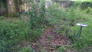Let's start with the previous picture. It's the "Grave Site" next to the back deck. It has a buttonbush, but it's also covered in sedge, basketgrass, deertongue, camphor, cherry laurel, asters, and whatnot. Off to the right is the trail that leads to the rain garden, hidden in grass, sedge, and asters. Here's another look toward the rain garden.