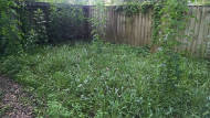 On the very left is a new patch of inland sea oats that I'm hoping is strong enough to one day begin spreading and crowd out all the other crap. But for now, there's a ton of white and purple asters — purple being the really tall stuff — that I'm unsure about keeping, but the fall pollinators rely on them and I've got nothing else for them right now. Underneath those tall guys are exotic spiderwort (not the native one), Virginia creeper, camphor, sedge, deertongue, straggler daisy, crap grass, and unknown things. By the bird bath are the two Virginia sweetspires that are steadily becoming bigger. Let's move on though.