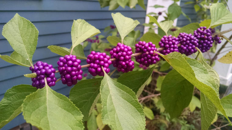 The two oldest American beautyberries by the front porch have gotten big. They are covered in bright purple berries. Already, I've seen some mockingbirds eating them. It's usually the robins who eat them and only in a couple months from now. I'm going to prune them back in late winter to see how well they take to it. They don't have a whole lot of room left to grow into where they are.