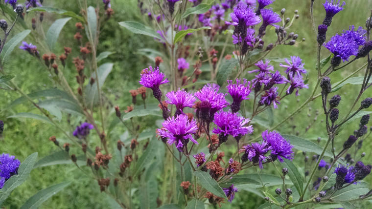 I'm not sure where this ironweed came from. Last winter, I moved it from the grass to my new front bed. I also spread some seeds around and now have 3 established. Fall seems to be the season for purple.