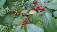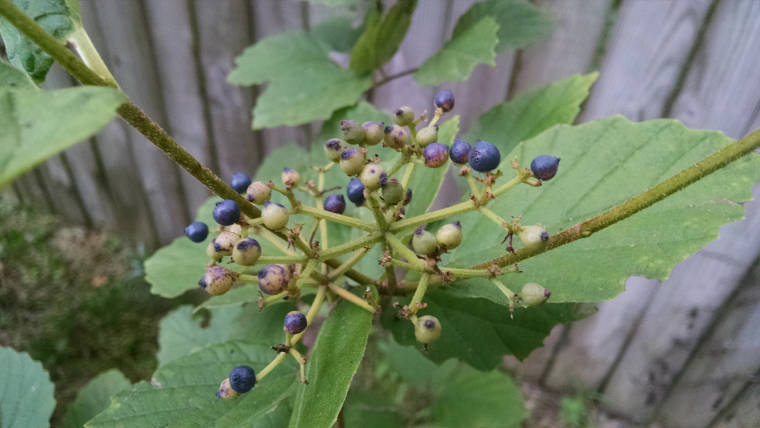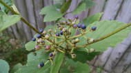 I planted this new arrowwood viburnum just as my original one was finishing flowering in the spring, so they didn't get to cross-pollinate much, a requirement of the species to produce fruit. But since the newer one flowered later, it did get a bit pregnant. These berries are the result. They are now starting to mature, turning a dark purple.
