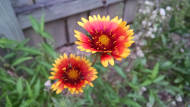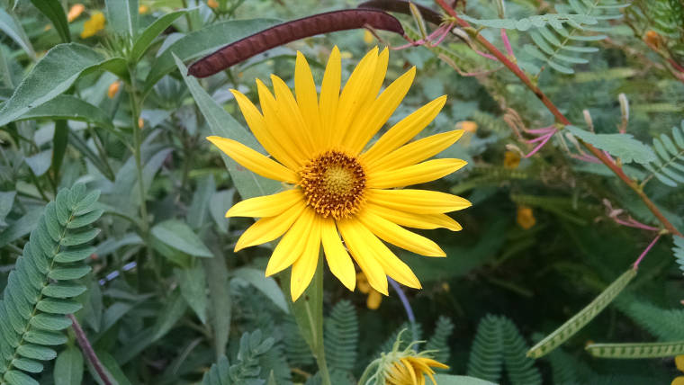The maximilian sunflower is tucked away inside the partridge pea. It's not getting a lot of action as bees seem to favor the latter. Also, having the same color of flower, it's easy to miss.