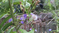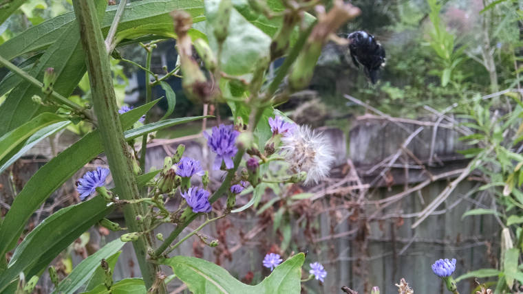 The exceptionally tall woodland lettuce — about 12 feet — are visited by lots of bees, wasps, and miscellaneous flies. It was also hard to get the camera to focus on these, but I managed to get a bee in mid-flight. I'm sure the more conventionally minded neighbors hate these as the leaves look "trashy", the flowers are tiny, and their height is so commanding.