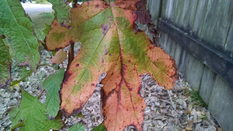 I have yet to see my oakleaf hydrangea having a good year, but this newest member of the family is showing some good leaf coloration.