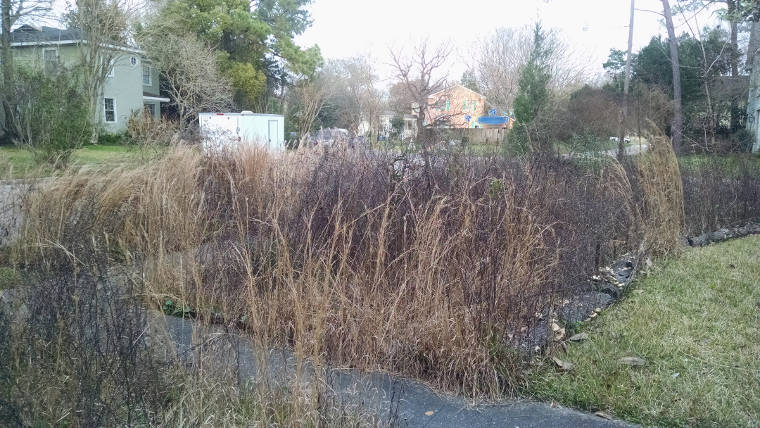 This is surely a most confusing mess to people. It's the winter end of calico asters, broomsedge, blue mistflower, ironweed, etc. The aster is an early-succession species and won't be there in such large amounts longer term as other plants fill in. And why not cut then all down? Because insects (and a bird) are living there through the winter. I'll be cutting them down this weekend as spring has arrived very early this year and seeds are starting to sprout already.