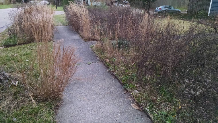 To me, this is a prettier angle of the front sidewalk. The vertical form of the broomsedge makes a lovely wall for anyone walking by. The area in the bottom-right of the frame is what I hoed and sowed almost a year ago. I didn't remove all the turfgrass like I normally do, partly as experiment and partly because it's just so much work. It can only improve as I've been dumping lots and lots of seed in it over the past year.