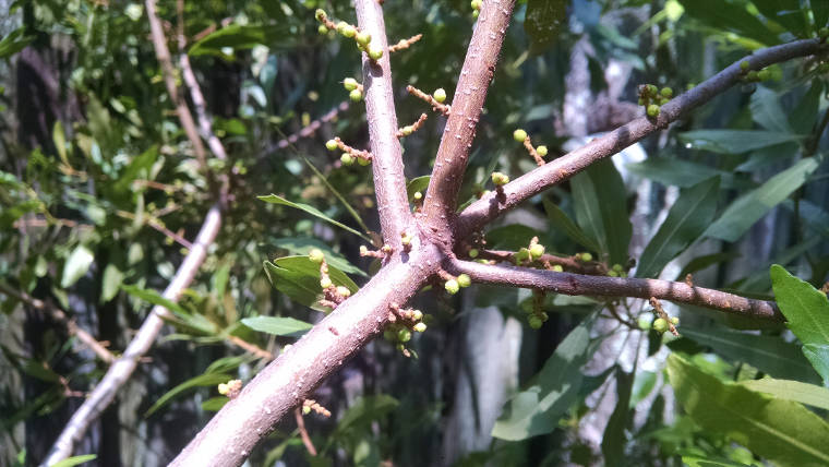 Last month, I noticed that my wax myrtle had a lot of little green balls all over. I figured they were the beginnings of fruit, which means I have me a female! I never even noticed the flowers.