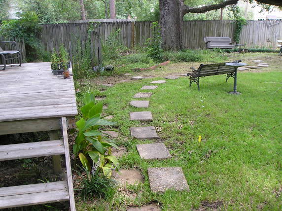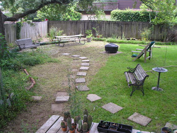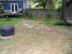 Today was the day to scalp some turf grass in preparation of my hoeing next month (or so), which I'll be doing instead of tilling. I dropped the mower and went at it. I went slowly to give grasshoppers a chance to hop away. Then I moved the stepping stones to what may or may not be their final locations. I just placed them on top of the ground without digging. I think I'll level a couple of them later on when I decide it's good.